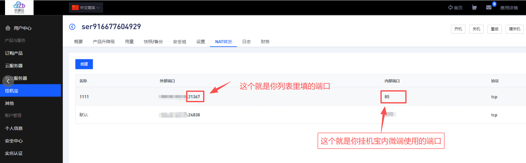 2、登陆玖趣云后台,找到购买的挂机宝,点【NAT转发】,创建,